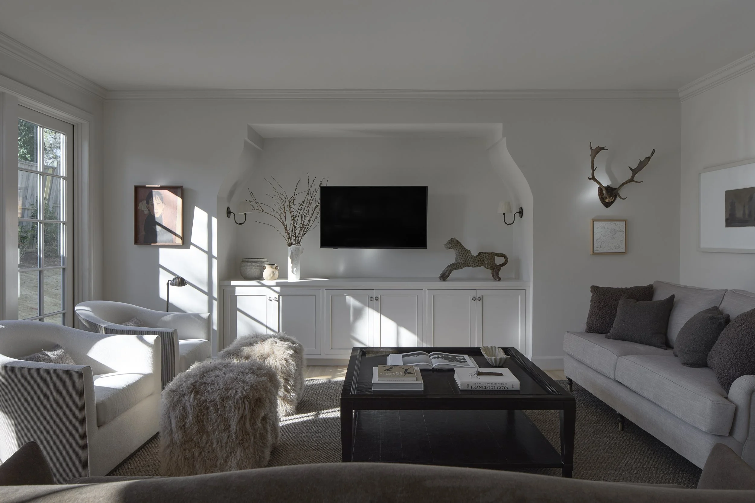 A layered, inviting living room designed with custom finishes, curated furnishings, and interesting architectural details.